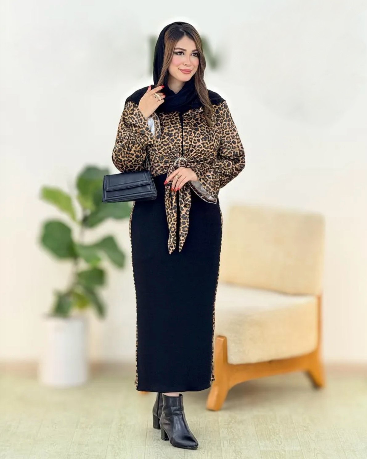 ست سه تیکه شومیز پلنگی دامن کمربند جگوار جنس دامن لینن شومیز بوگاتی فری سایز ارسال رایگان