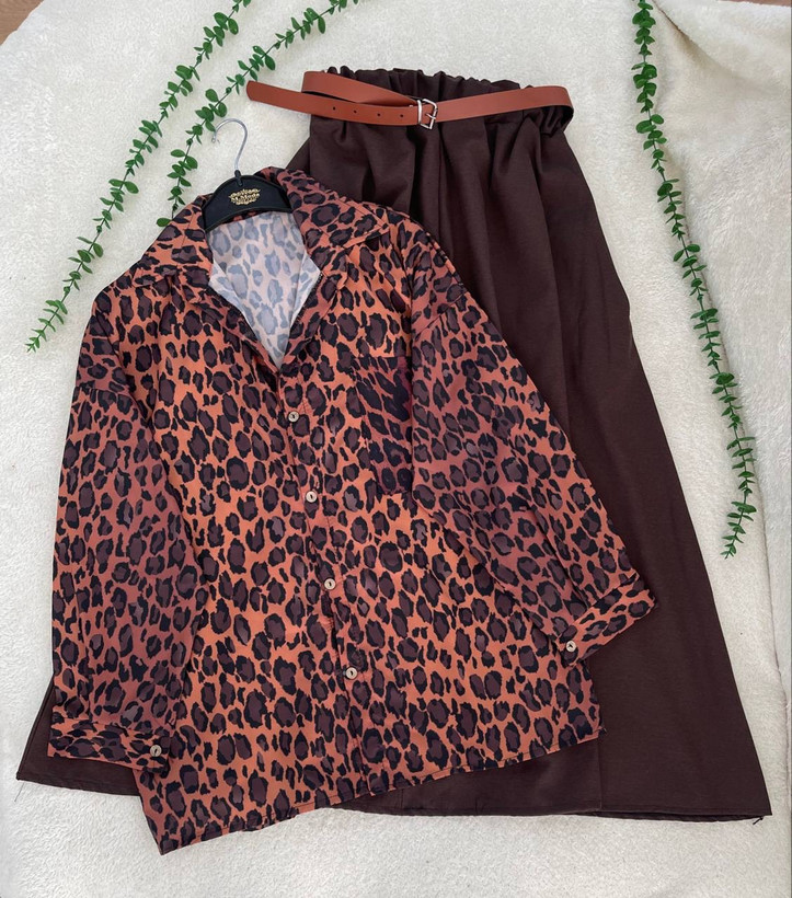 ست سه تیکه شومیز پلنگی دامن کمربند جگوار جنس دامن لینن شومیز بوگاتی فری سایز