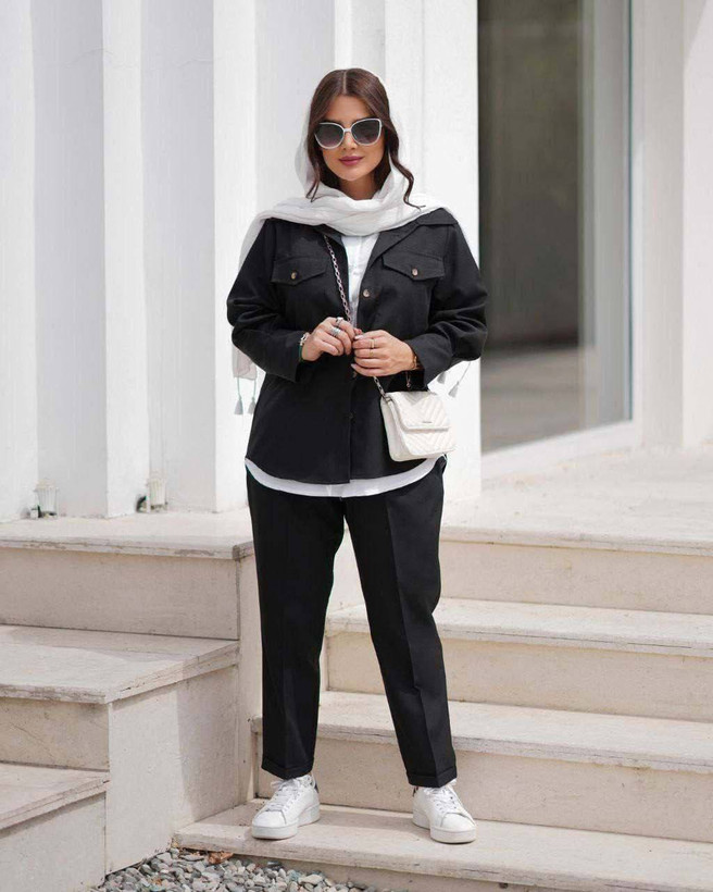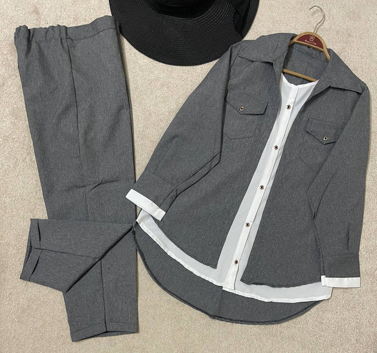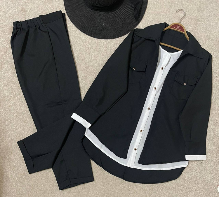 سایز ها : فری از 38 تا 46-48 - قد مانتو جلو حدود 77 پشت حدود 84 - دورسینه حدود 120 - قد استین از یقه 72 - قد شلوار حدود 92 - پشت کمرشلوار کش میباشد - شومیز به مانتو متصل میباشد