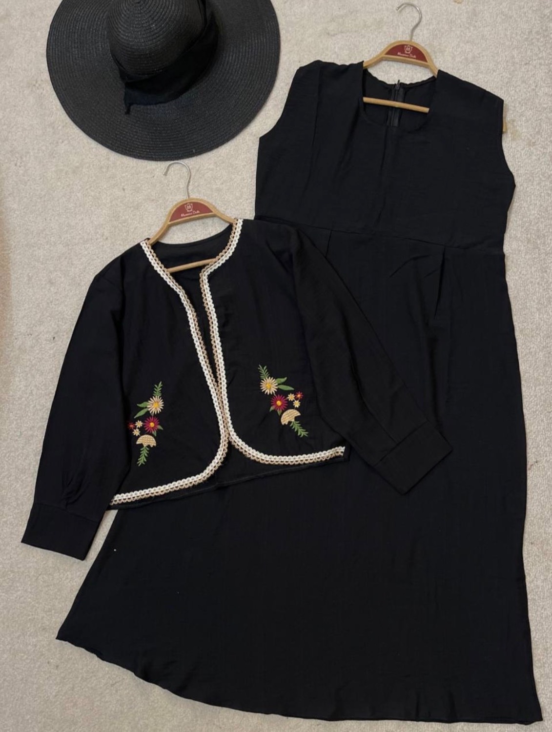 جنس : شانتون صوفیا رنگ بندی : مشکی سایز ها : فری از 36 تا 46-48 قد سارافون حدود 125 - دورسینه حدود 104 - قد کت حدود 49 - دورسینه 106 - قد استین از یقه حدود 62 ✅گلدوزی متفاوت